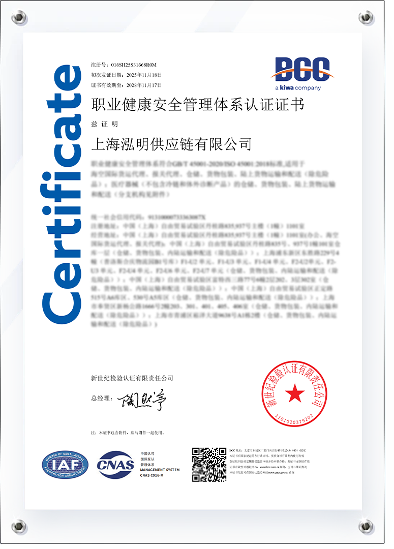 近日,经过权威机构的严格审核与评估,泓明集团旗下上海泓明供应链有限公司、上海泓明国际货运有限公司与上海泓明医疗供应链服务有限公司同步通过ISO45001:2018职业健康安全管理体系国际认证,成为行业中在职业健康安全管理领域率先全面接轨国际标准的标杆企业之一。
